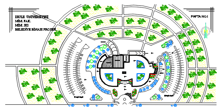 building dwg file, it is the complete top view of the building, circular design, landscaping etc