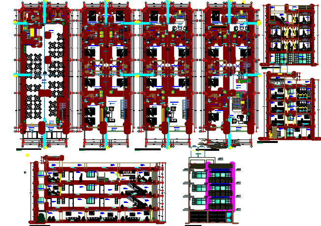 Hotel dwg file , layout plan and elevation of the building, various different layout structures and elevation