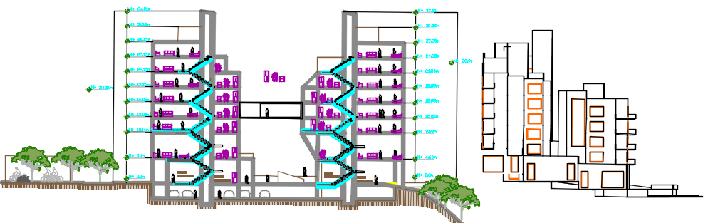 building dwg file, elevation details of a corporate building, landscaping, roadside view etc