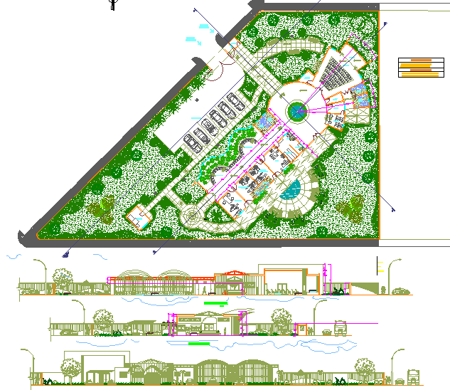 Health Center dwg file. Layout plan, landscaping design, section plan and elevation design of Health Center project...