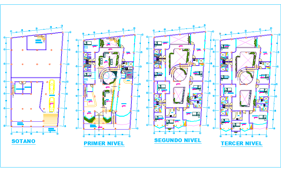 Bungalow Plan dwg file. Find here layout plan of all floor with furniture detailing also have detailing of foundation plan.