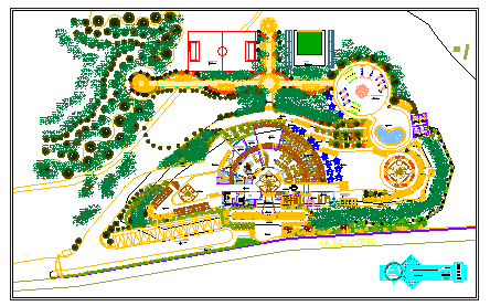 Design of restaurant with in-out way walking way and zoo,bedroom,pull and children playing area,walking way ,reception,garden,office,kitchen and dining hall.