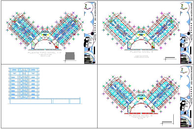 Design of hotel wit in-out way with plan and elevation with room, elevator and with dining table washing area,and bedrooms and view of terrace.