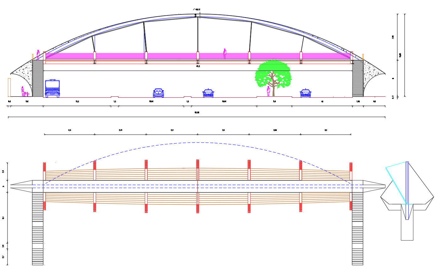 Peatonal Bridge dwg file. Find here footbridge is a bridge designed for pedestrians, also has section plan and elevation design of bridge project.