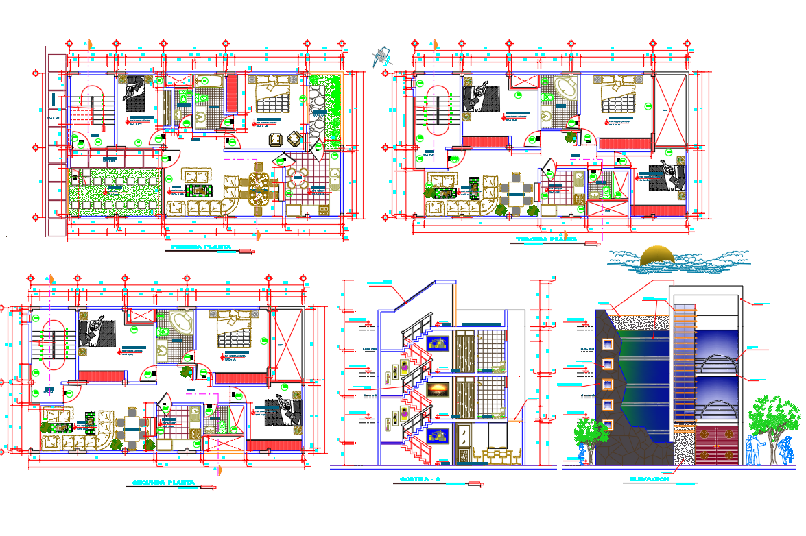 multi family housing dwg file, layout plan and elevtaion of a big house, with furniture detailing in autocad