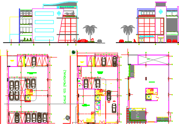 bank office building dwg file, elevation of a building, bank office details and layout plan of car parking