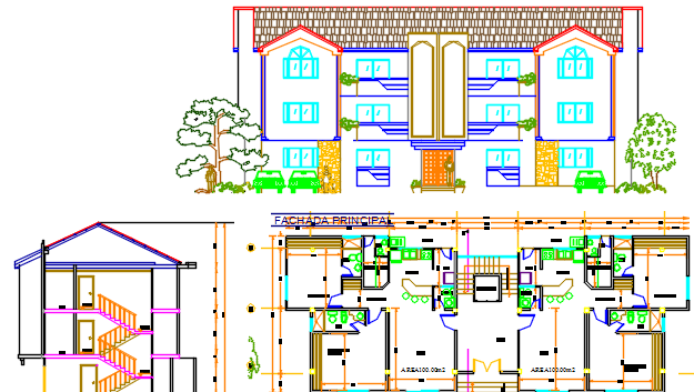 bungalow dwg file, elevation of a big bungalow design, its layout plan , furniture, landscaping, garden etc