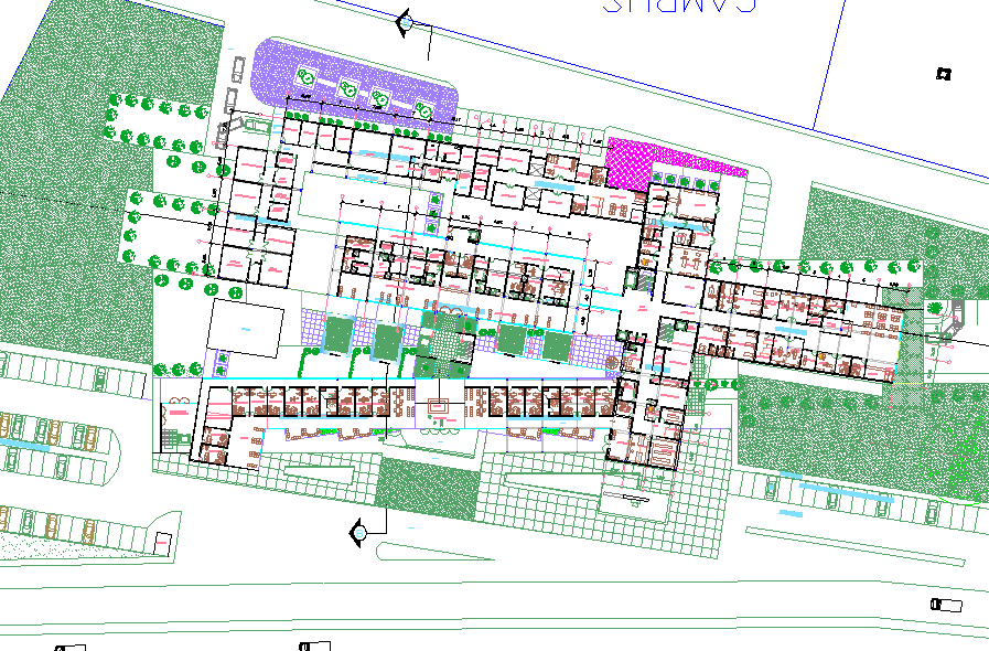 Civil Hospital dwg file. Find here layout plan along of furniture detailing also has landscaping design in autocad file..