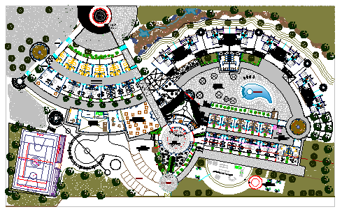 Design of hotel with in out way and with restaurant,coffee bar,dining hall,swimming pool,sport and washing area tree view,service center,room,office.
