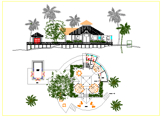 Design of hotel with plan and elevation with in-out way,with deposit counter,bar,