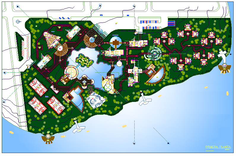 Plan of design of hotel with its layout with in-out way,parking area,garden,hall,