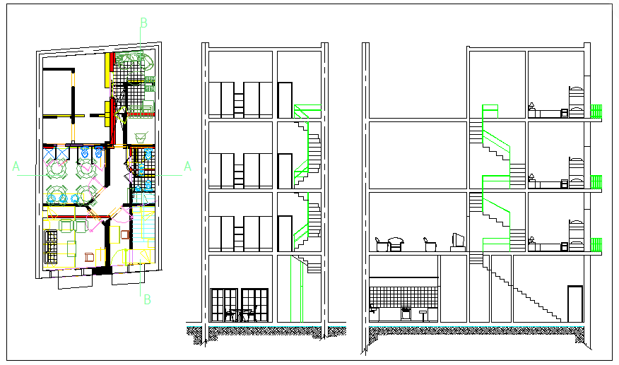 Design of hotel with plan elevation and detail of drawing with in-out way,kitchen, dining area,washing area,seating area,room with T.V,staircase,and elevation and plan detail.