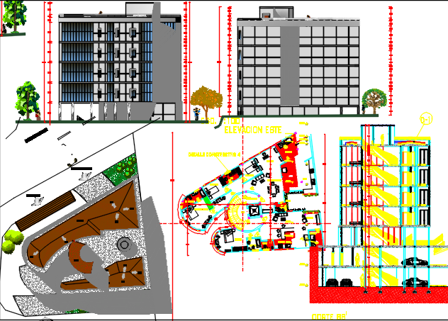 building dwg file, elevation of various building, glass building, layout plan of a building etc