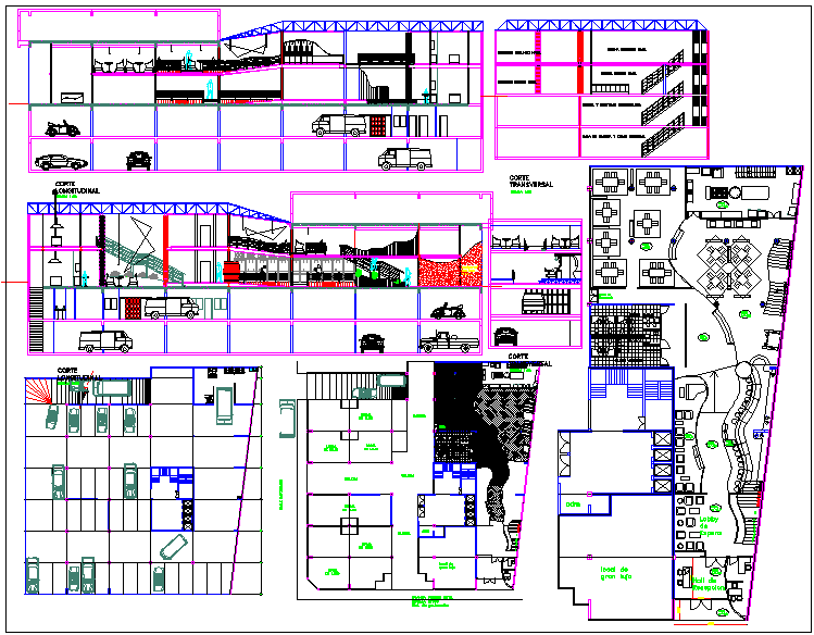 Find here layout plan include 2 level vehicle parking arrangement, section plan, structure plan and elevation design of Restaurant project..