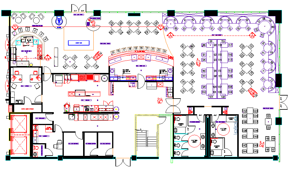 Restaurant plan dwg file. Find here layout plan along of furniture detailing in autocad format.
