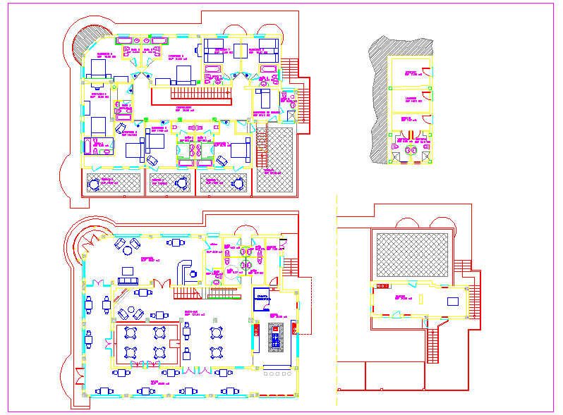 Hotel planning with reception,washing area,bar,kitchen,dining area,room,in-out way ,storage room,distribution area of hotel.