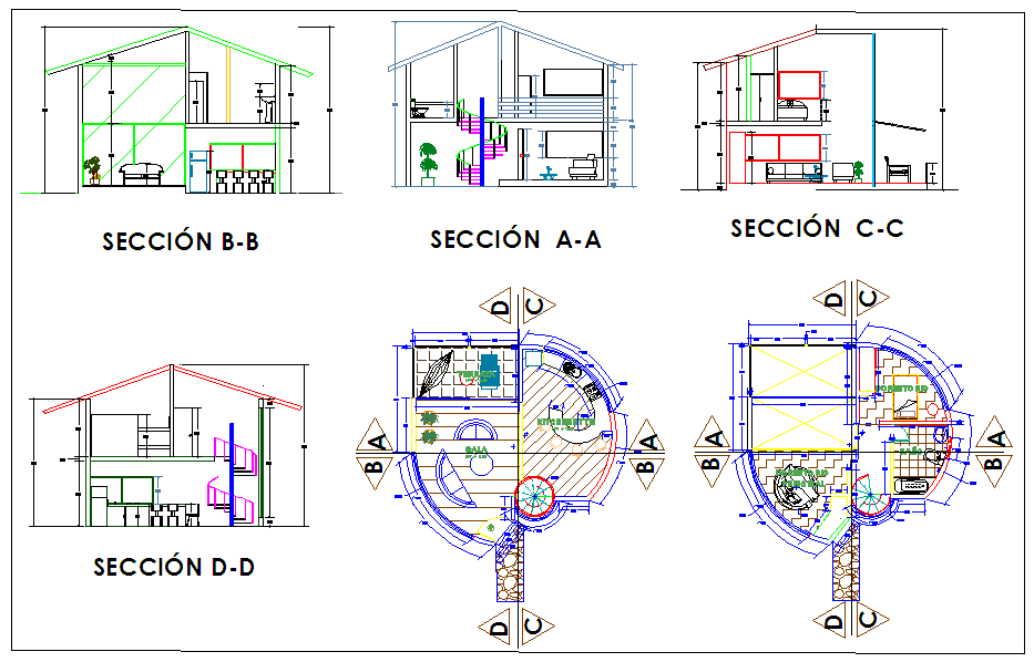 Bungalows Design dwg file with plan,elevation,section view,kitchen,bedroom,in-out way,washing area,staircase and terrace,view of flower pot and sofa set.