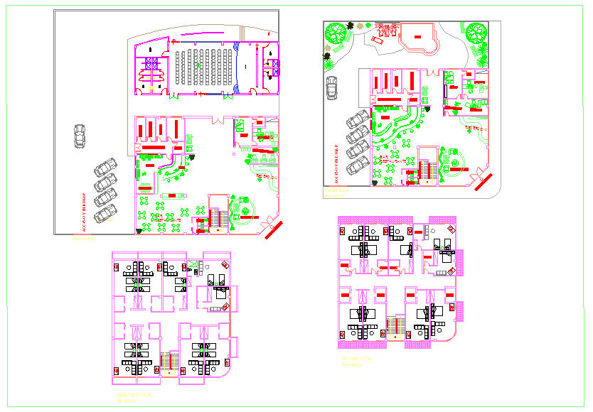 Hotel Design dwg file with parking way,garden,bar,restaurant,waiting room,kitchen, bar,deposit counter,admin office,table view,washing area,pool,bedroom,T.V area,walking way.