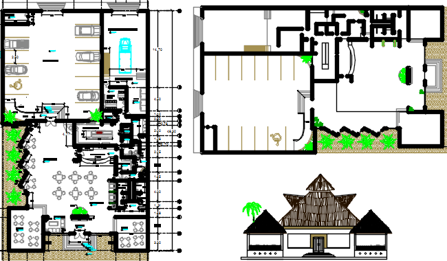 restaurant dwg file, various elevations of hotels ,landscaping, trees, big hall, swimming pool, beach side view. rooms, exotic design hotel design in autocad format