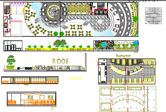 Hotel dwg file , theme based hotel design, african theme based restro, big hotel, landscaping, trees, furniture layout etc