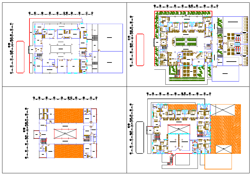 Hotel Design dwg file with reception,tree view,hall,restaurant,central garden,washing area,room,admin office,table view and in-out way.
