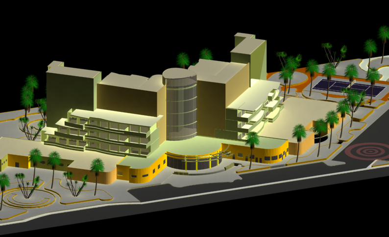 This 3D Modern Hotel AutoCAD DWG file presents a full architectural design with a rendered 3D model showing the hotel’s structure, façade, and surrounding landscape. The drawing includes well-defined building blocks, outdoor areas, road access, and a circular driveway. The elevation is enhanced with realistic shading and surface detailing, making it perfect for concept visualization and presentation. Every component, from the entrance lobby to the outdoor pool and parking zones, is positioned with accurate proportions ideal for construction and planning references.