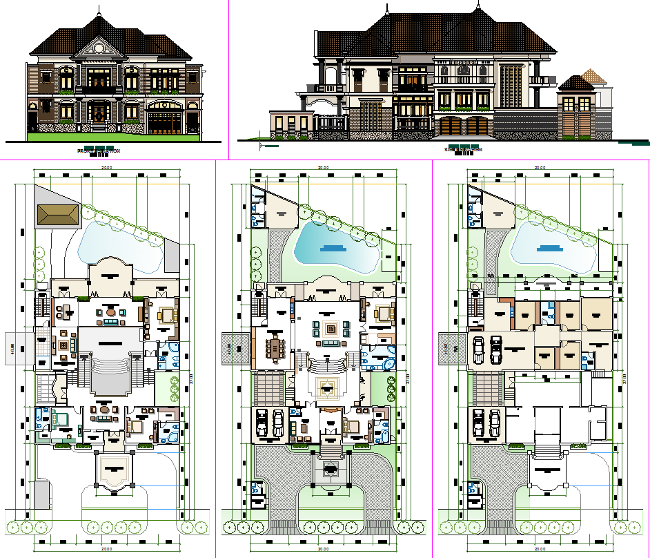 This Family Bungalow AutoCAD DWG file features an elegant architectural layout showcasing detailed floor plans, furniture placement, and exterior elevations. The file presents a three-level bungalow design with precise measurements, landscaped garden areas, parking spaces, and a swimming pool. Each floor plan is labeled with living spaces, bedrooms, bathrooms, and utility zones, ensuring a complete understanding of spatial organization. The drawing also includes front and side elevations that define the classic architectural style with realistic proportions and façade detailing.