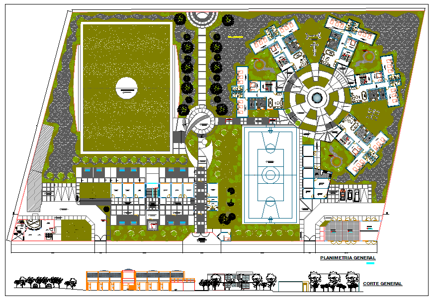 Hotel plan dwg file with walking way,garden,kitchen,washing area,sports field,parking way,bedroom,table view,flooring area,door and window view of elevation, in hotel plan.