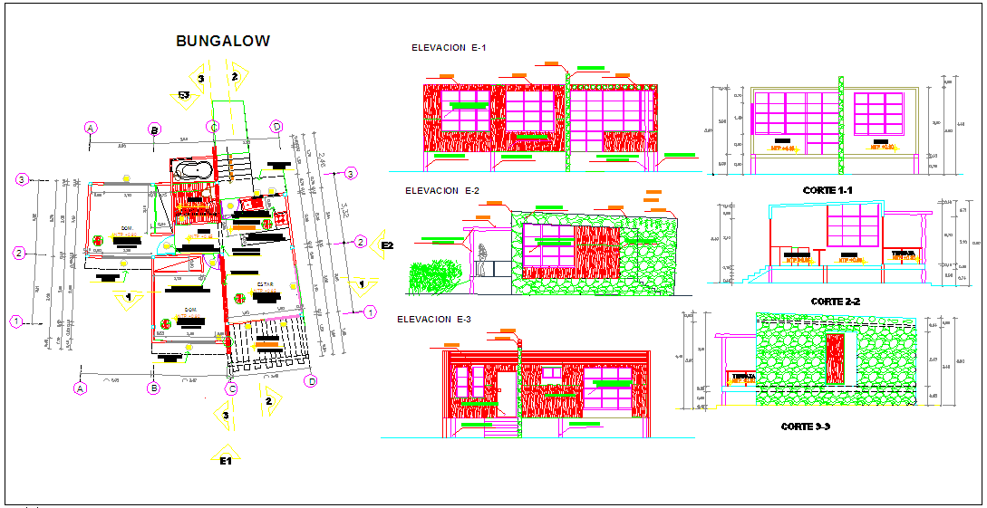 Bungalows Design dwg file with in-out way,plan and elevation of kitchen,hall,room. terrace,window,door,staircase,tree view and flooring view with stone with bungalows design.