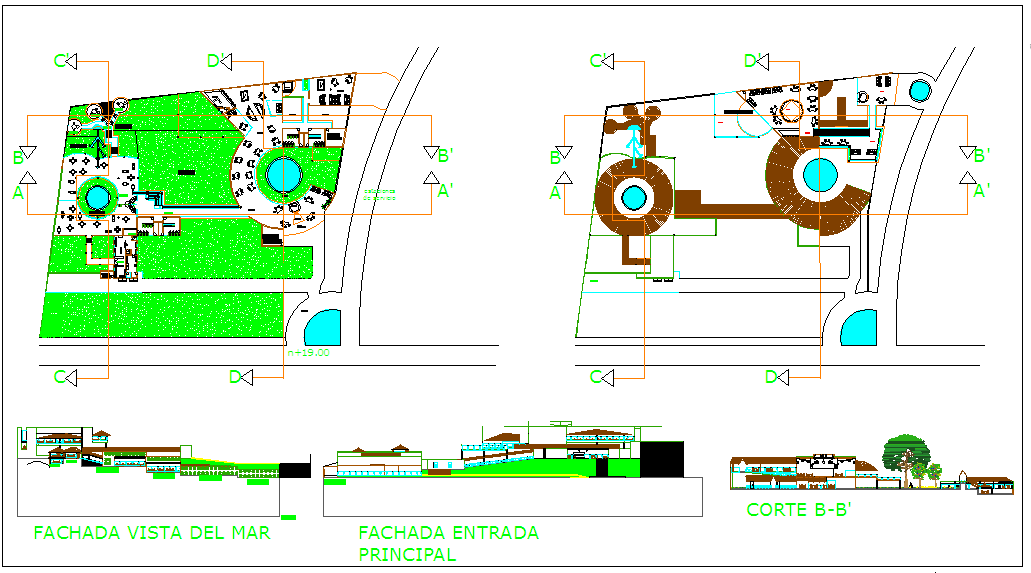 Hotel Design dwg file with entry way,garden,table view,circle,bar,entry way,waiting room,washing area,elevation view.kitchen,tree view,seating area,circle shaped