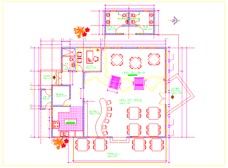 Plan of hotel dwg file with in-out way,washing area,mesas area,bar,admin office, kitchen,walking way,bedroom,terrace,tree view in plan of hotel.