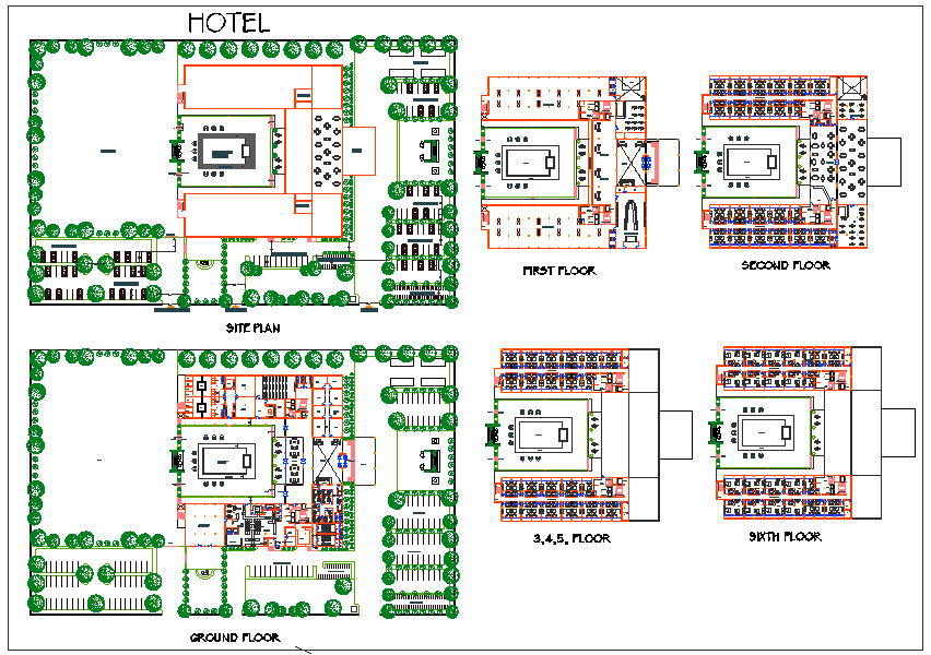 Hotel Design and lay-out detail dwg file with in-out way, lawn,parking way,swimming