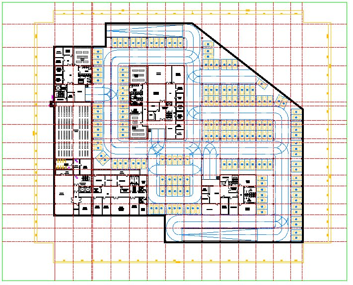 Ground floor view of hotel dwg file with walking way,hall,deposit counter,parking area,washing area,office,table view.