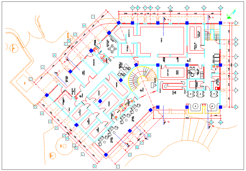 Plan of hotel dwg file with entry way,washing area,office,kitchen,deposit counter,bar,