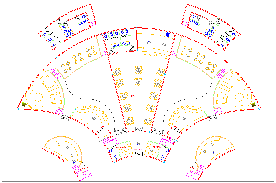 Hotel Design dwg file with entry way,washing area,ticket office,bar,tree view,seating area in circular way,walking way in hotel design.