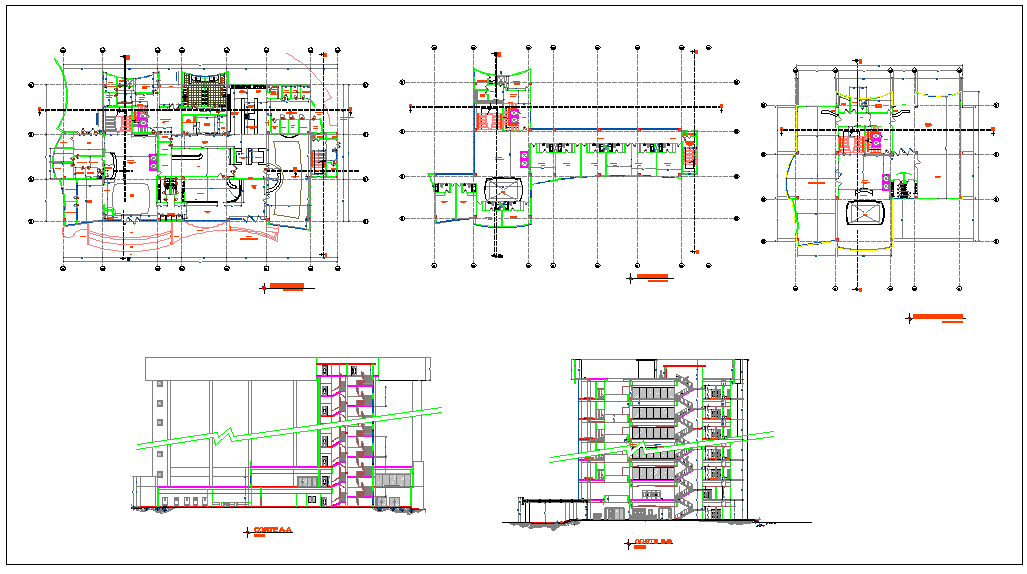 Plan of hotel dwg file with entry way plan and elevation of hall,reception,laundry, washing area,dining room,kitchen,sea food and dairy product storage area,parking way,room.