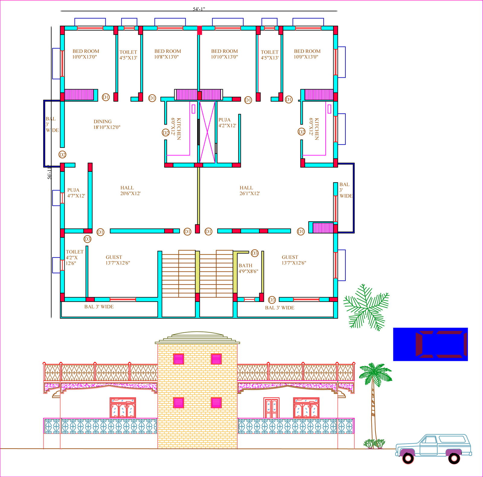 this is a 2D plan view for two families in single building. the plan fulfill all the requirements of the customer. the plan is well designed and decorated. the building is look like so beautiful and its 3D look is so pretty. the plan is for fully residential building and generally for all family requirment. the area required for this plan is 60ft.X60ft.