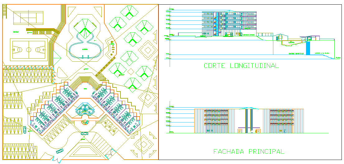 Hotel project planning dwg file with in-out way,parking way,bedroom,washing area, lobby,swimming pool,seating area,elevation view with door,window and staircase.