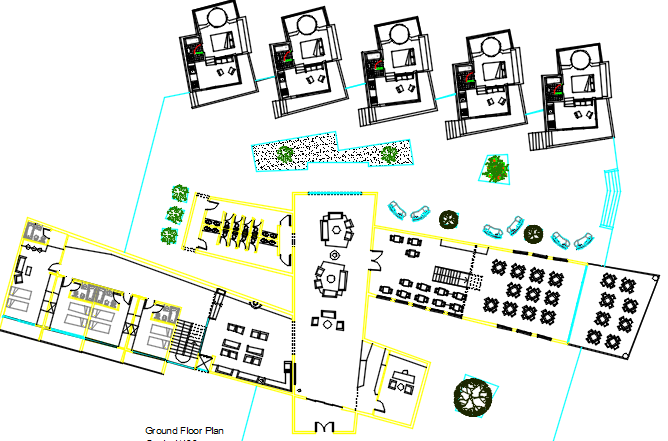 resort dwg file, elevation of a big resort, layout plan of resort, furniture detailing, party area, water side, banquet etc