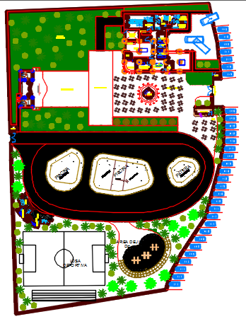 restaurant dwg file,layout plan and elevation design, swimming pool, landscaping, trees, big hall, rooms, exotic design