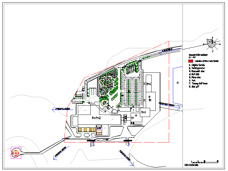 Landscape design of hotel dwg file with entry way,garden view,dinning area,tree view,