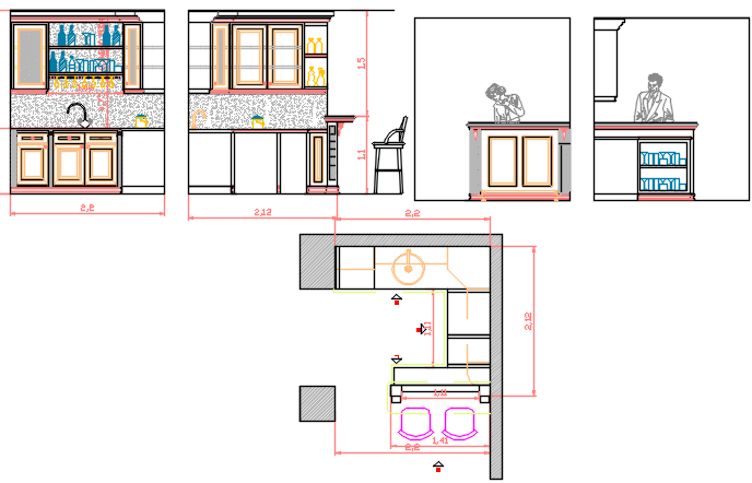 cafe dwg file, elevation details of a cafe, the counter area, waiting area, seating area, and layout plan of cafe in auto cad format