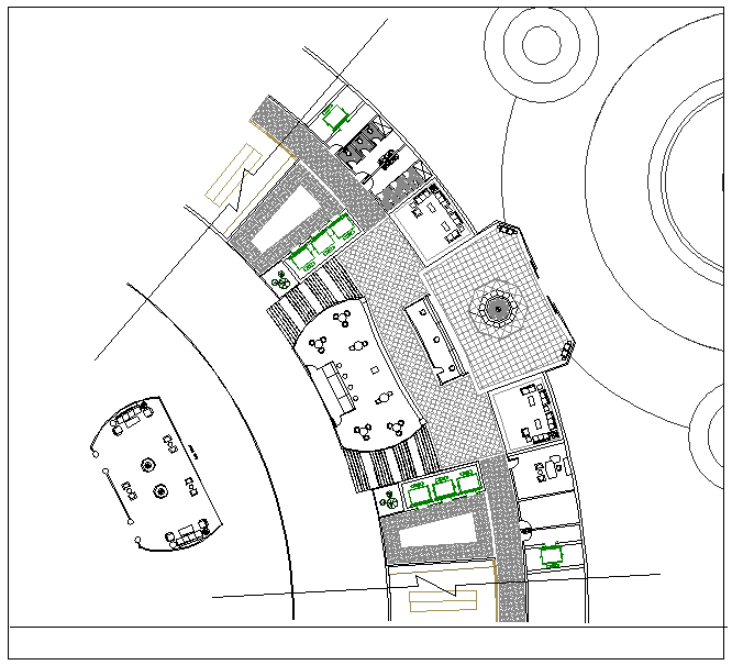 Plan of hotel dwg file with entry way,walking area,flooring view,seating area,washing area,table view,distribution of area,circle on walking way.