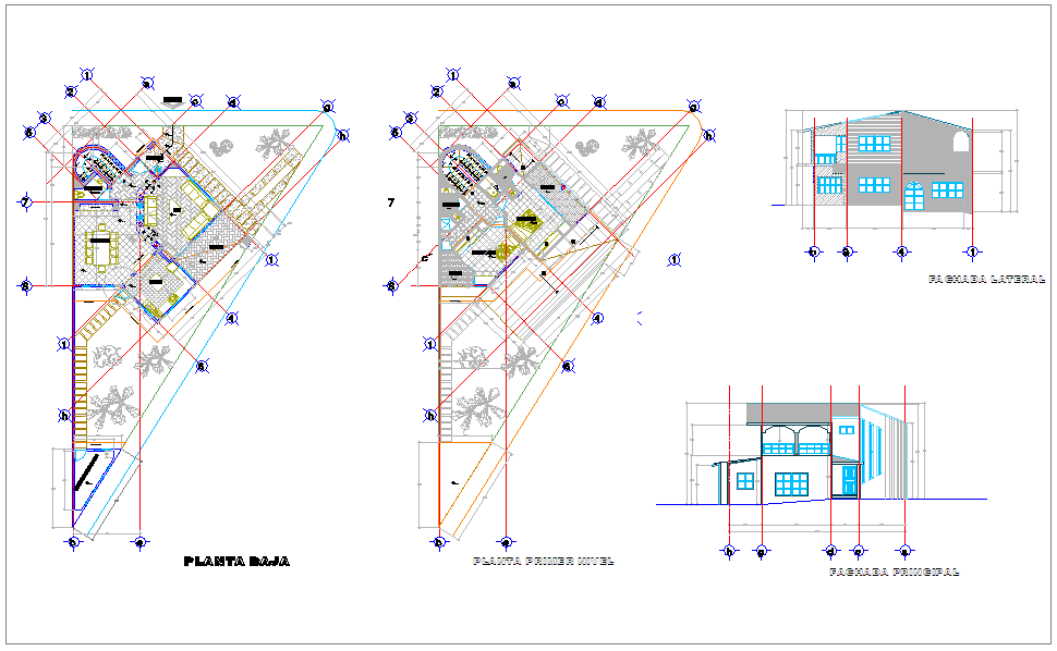Housing design dwg file with in-out way,flooring area,Dinning room,garden view,wash ing area,terrace,kitchen,bedroom,living room,door-window and balcony view in elevation.