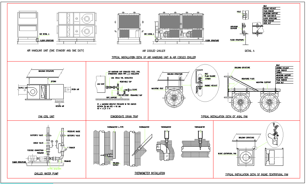 Technical Installation centrifugal fan dwg file.. centrifugal fan is a mechanical device for moving air or other gases, thermometer installation, typical installation detailing of air handling unit and air cooled chiller