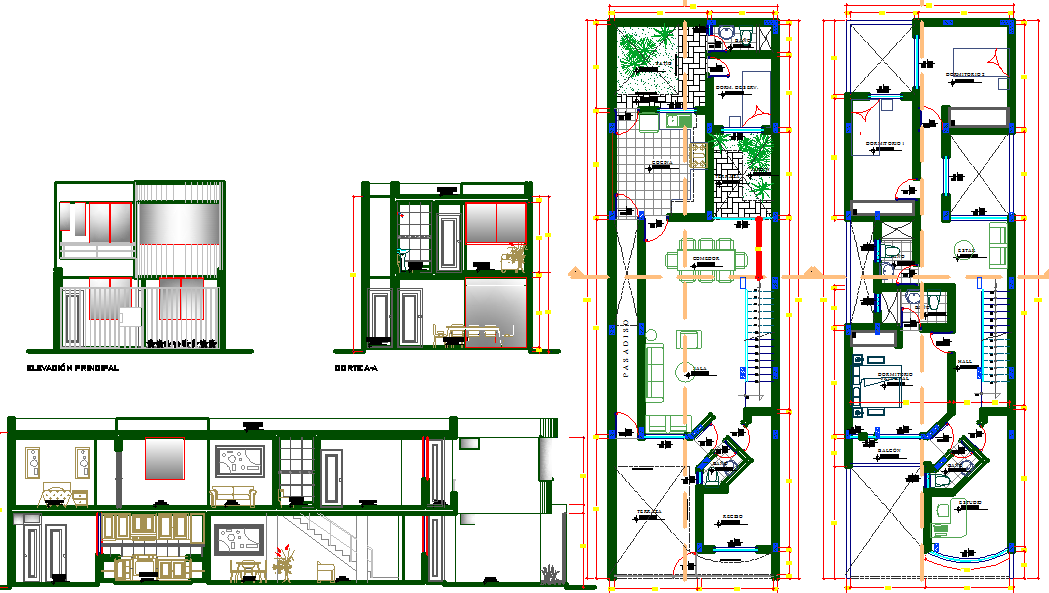 2 Story House CAD Drawing with Elevation, Section, and Plan Layouts