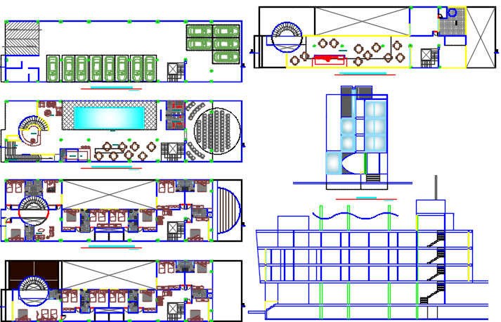 restaurant dwg file, layout plan of a big hotel, elevation design of hotel, posh hotel design, big hall, rooms, exotic design , posh hotel
