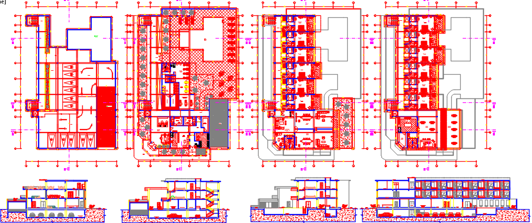 Hotel dwg file , layout plan of a big hotel, elevation design of hotel, posh hotel design, various rooms, double beds, single beds, couch, reception area, waiting area in autocad format