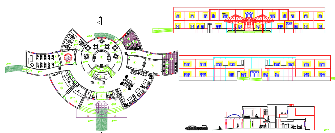 Hotel project dwg file. Find here layout plan include bedrooms and restaurant, structure plan, section plan and elevation design of Hotel project.