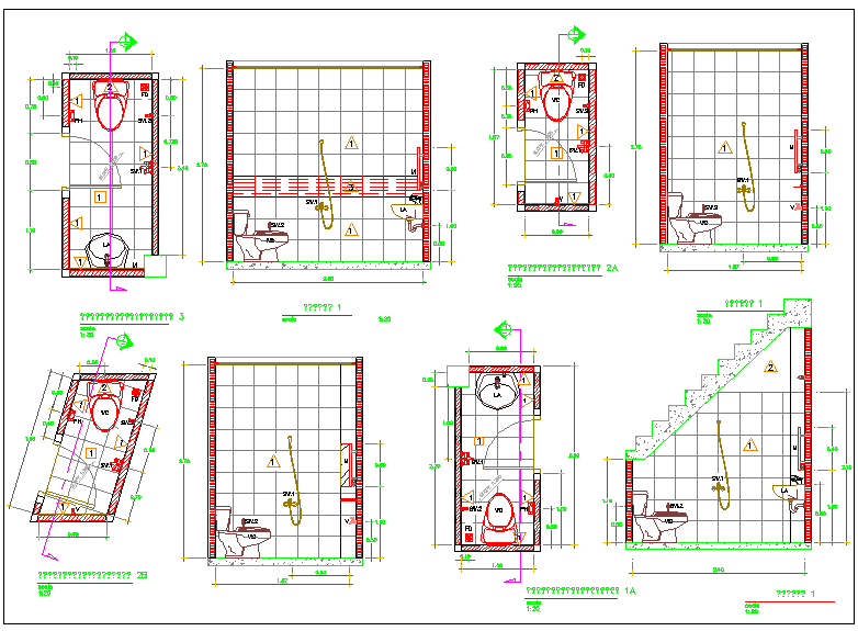 Bathroom and Toilet dwg file. Find here layout plan, section plan, plumbing installation plan and sanitary ware detailing in autocad format..